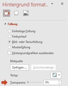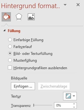 - Selektiere im Aufgabenbereich Hintergrund formatieren unter Füllung die Option Bild- oder Texturfüllung.