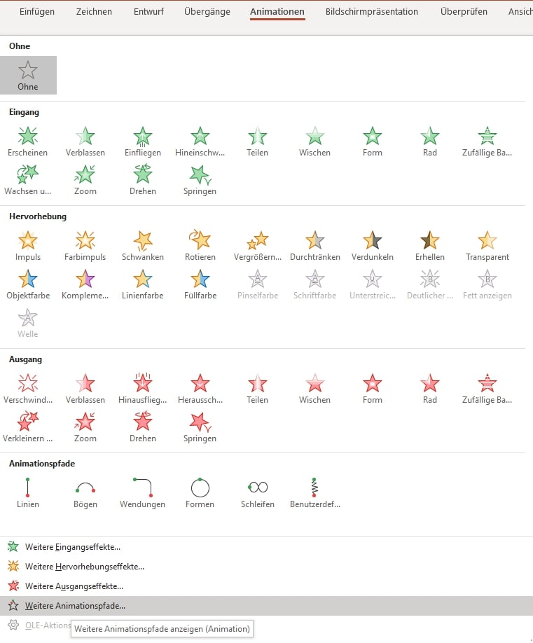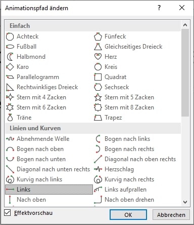 - Scrolle über die Bildlaufleiste nach unten und wähle den Befehl Weitere Animationspfade → Linien und Kurven → Links.
