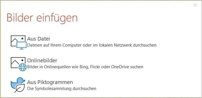 - Online-Bilder: Durchsuche Bilder in Online-Quellen wie Bing, Flickr oder OneDrive.