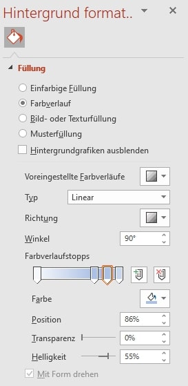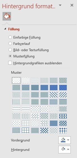 - Gehe auf die Registerkarte Entwurf und wähle die Option Hintergrund formatieren aus. Hier kannst du die Art der Füllung festlegen: Einfarbige Füllung, Farbverlauf, Bild- oder Texturfüllung und Musterfüllung.