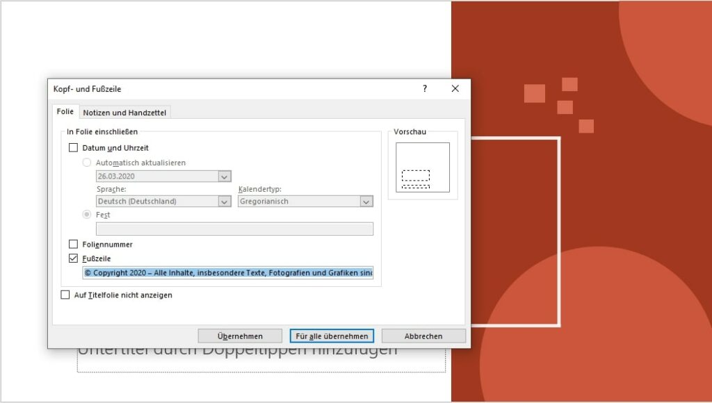 - Gib im Feld unter Fußzeile den Copyright-Vermerk anhand des folgenden Musters ein: