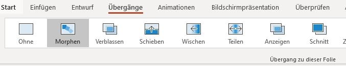 - Klicke auf das Duplikat und wähle über die Registerkarte Übergänge/Übergang zu dieser Folie die Option Morphen aus.