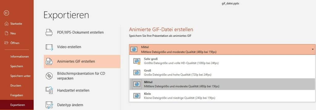 - Wähle anschließend im Menüband die Befehlsfolge Datei/Exportieren → Animiertes GIF erstellen.