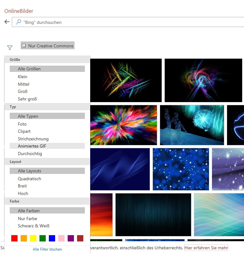 Du kannst auch im Web nach GIFs suchen und dazu die Methode Onlinebilder einfügen oder ClipArt einfügen verwenden.