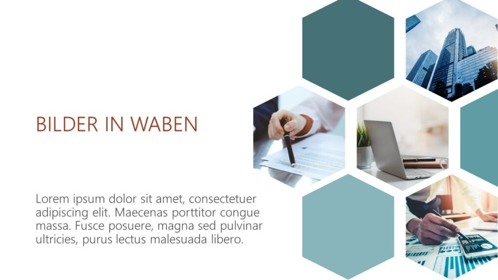 Bildplatzhalter müssen nicht zwangsläufig rechteckig sein. Sie können jede beliebige Form annehmen. In manchen Fällen bietet es sich an, Bildplatzhalter in Kreisen oder Waben zu erstellen. Damit sorgst du auf deinen Folien für Abwechslung und beeindruckst dein Publikum mit Folien mit Wow-Effekt. Wenn du bereits Folienlayouts mit rechteckigen Bildplatzhaltern erstellt hast, kannst du die Form ganz einfach über die Masteransicht ändern. In der Masteransicht wandelst du über Zeichentools → Format → Form ändern deine Form auf jede beliebige Form aus dem Formenkatalog um.