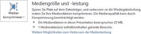 Antwort: Eine explizite Einstellmöglichkeit – wie beim Komprimieren von Bildern – gibt es für Audio und Video nicht. Doch beim Komprimieren von Mediadateien prüft PowerPoint, ob das Video zugeschnittene Bereiche enthält, und entfernt sie automatisch beim Komprimieren. Abbildung: Medien komprimieren – beim Komprimieren von Multimediadateien (Sound oder Video) erkennt PowerPoint gekürzte Bereiche und entfernt diese.