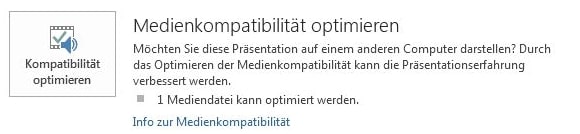 Ist dein Video-Format nicht geeignet für die Anzeige auf einem anderen Gerät, zeigt PowerPoint die Option Kompatibilität optimieren an. Zeigt PowerPoint diese Option nicht an, liegen bei deinem Datei-Format keine Kompatibilitätsprobleme vor.