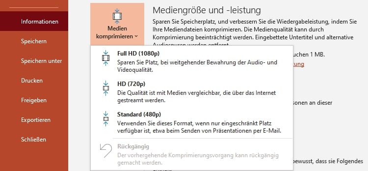 - Wähle über Datei → Informationen den Befehl Medien komprimieren aus.