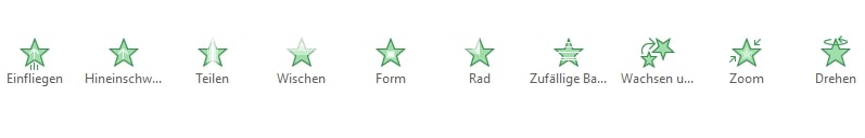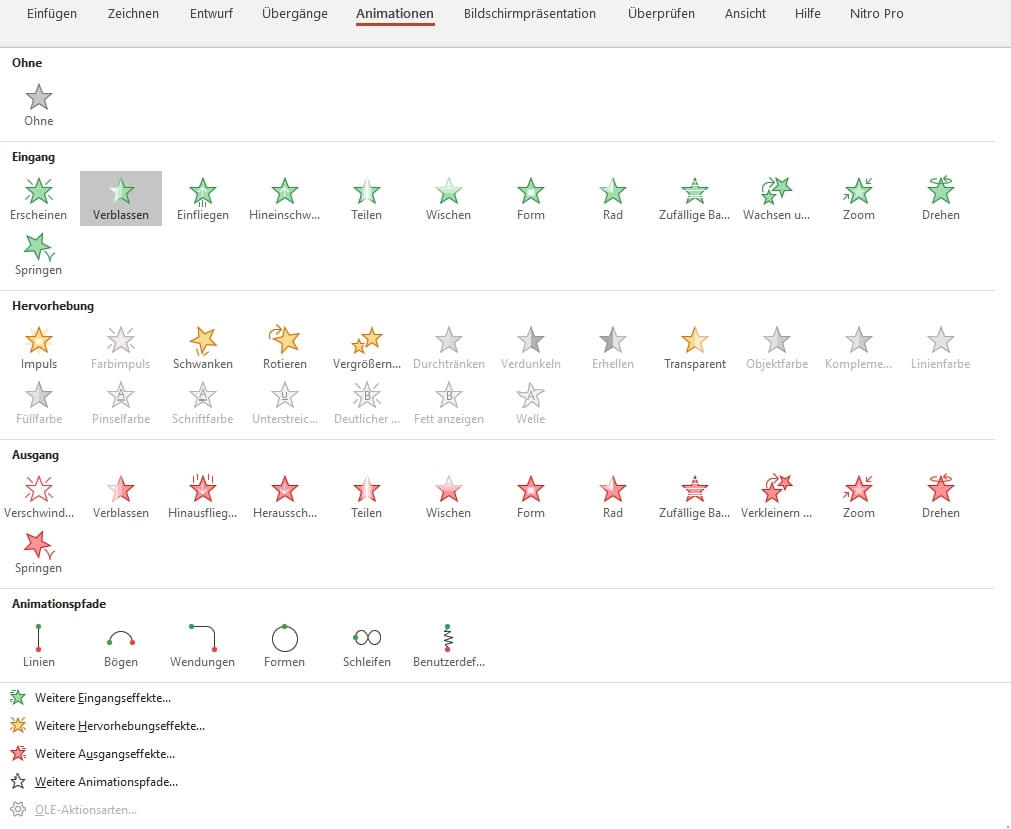 Du möchtest ein Objekt animieren und klappst auf dem Register Animationen den Katalog mit den verfügbaren Animationen auf. Leider fühlst du dich von der Vielzahl roter, gelber und grüner Sternchen erschlagen. Was bedeuten die Sternchen und Farben vor den Animationen? Wir erklären dir die Bedeutung: