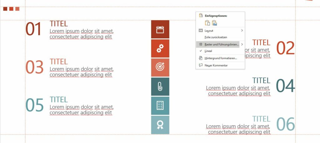 - Wähle per Rechtsklick auf die Folie Raster und Führungslinien aus.