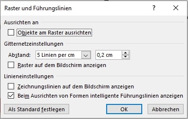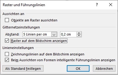 - Es öffnet sich das Dialogfeld Raster und Führungslinien.