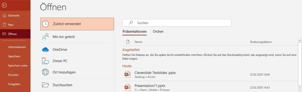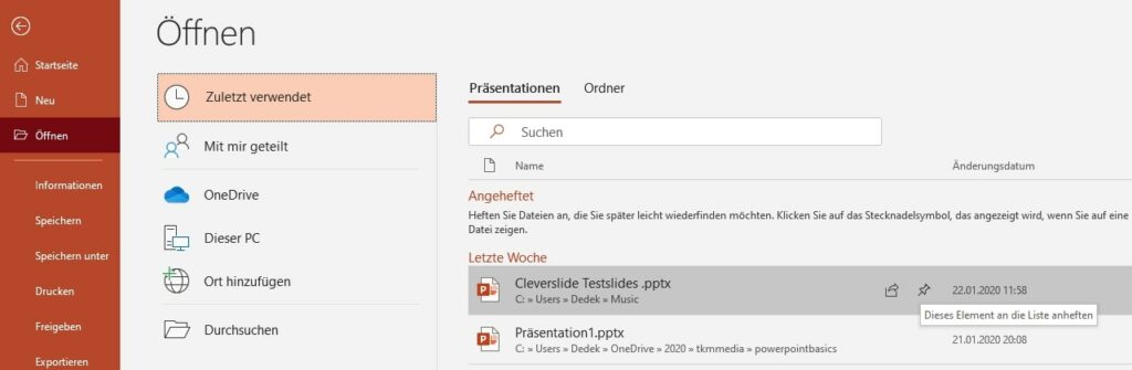Zuletzt verwendet: PowerPoint listet dir deine zuletzt verwendeten Dateien chronologisch auf.
