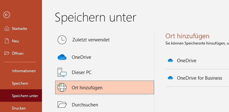 Ort hinzufügen: Du kannst Speicherorte, wie OneDrive oder OneDrive for Business hinzufügen, um das Speichern deines Dokumentes in der Cloud zu erleichtern.