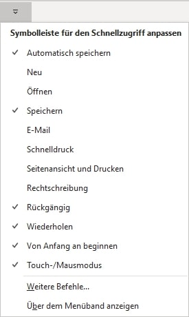 Möchtest du zusätzliche Befehle in die Schnellzugriffsleiste aufnehmen? Klicke im Optionsfenster Symbolleiste für den Schnellzugriff anpassen → Weitere Befehle