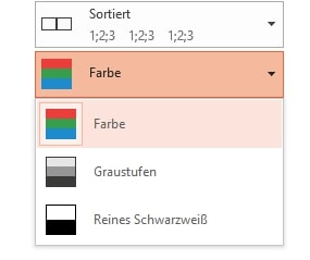 Auch die darunter dargestellten Optionen für Farbe und Foliensortierung sind auch über die Druckereigenschaften einstellbar, gelten hier aber auch zum Beispiel bei der PDF-Erstellung. Hier kannst du neben Farbe und Graustufen auch reines Schwarzweiß wählen. Das kann aber je nach Drucker zu seltsamen Darstellungen führen. Wenn du den Schwarzweißdruck zum Sparen teurer Farbtinte oder Toner in Erwägung ziehst, nutze besser die Funktionen der Druckvorschau und überprüfe die Ausdrucke am Bildschirm. So sparst du auch noch Papier.