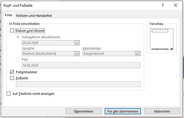 Der Link Kopf- und Fußzeilen bearbeiten zeigt das Einstellungsfenster aus unteren Abbildung. Hier kannst du die Inhalte für Kopf- und Fußzeilen auf Folie und auf Notizen- und Handzettelseiten einstellen. Die exakte Position kannst du auch festlegen, allerdings nicht über dieses Menü. Das zeigen wir dir weiter unten.