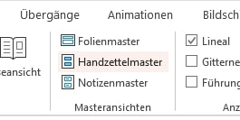 Die Layouts der Handzettel und Notizenseiten lassen sich über die Masteransichten definieren. Klicke dazu im Registermenü Ansicht auf Handzettelmaster oder Notizenmaster, wie links dargestellt.