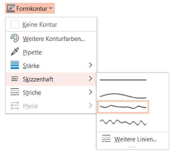 Für alle, die Objekte oder Schaubilder wie eine handgezeichnete Illustration oder wie eine Tafelskizze aussehen lassen möchten, gibt es eine neue Funktion: Für Formkonturen ist nun der neue Befehl Skizzenhaft verfügbar.
